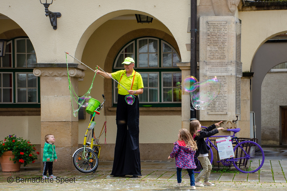 Ik ga het terras op van de ‘Hofkonditoren” onder een grote parasol om droog te blijven. Het is tijd voor koffie en warme Apfelstrudel mit Vanillesosse, ook warm. En die ís toch lekker! Daar word ik wel vrolijk van! Onbewust lik ik ongegeneerd het bord schoon. Ineens zie ik achter het raam – binnen zijn ook zitplaatsen – een man zich kostelijk vermaken om mijn kunstje. Oeps! Ach wat, ik maak mijn karweitje gewoon af. Intussen geniet ik op mijn beurt van de bellenblaasman. Met een emmertje sop en een koord tussen 2 stokjes maakt hij enorme bellen die de kinderen maar wat graag willen vangen.