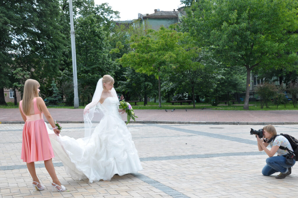 Kiev is de hoofdstad van Oekraïne, een flinke stad van 3-4-5 miljoen inwoners, niemand die het zeker weet. Maar op deze Pinksterdagen is Kiev behoorlijk verlaten. De hoofdstraat is zoals elke zondag deels afgesloten voor autoverkeer en bestemd voor alleen wandelaars. Goh, dat zouden ze in Nederland ook moeten doen! Het is heerlijk weer, blauwe hemel, stralende zon, geen zuchtje wind, 25 graden, perfect. Dat vinden de bruiden ook. De een na de ander komt het plein bij de St. Mikhailkerk op, een bruidegom zie ik niet, wel bruidsmeisjes in zalmkleurige outfits en fotografen.