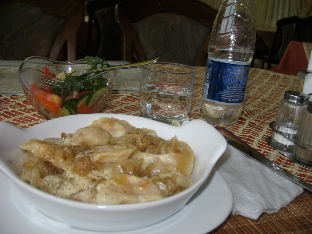 Ik kan inmiddels de trap niet meer op of af, knietjes kapoet. Het restaurant haal ik nog net en met een restje Servo-Kroatisch dat ik ooit heb geleerd en een heleboel gebaren bestel ik mijn eerste vareniki. Nationaal gerecht, kleine gestoomde deegenvelopjes gevuld met kool deze keer. Kapusta. Bijna elk Oost Europees en Centraal Aziatisch land heeft zo’n soortgelijk nationaal gerecht elk met een eigen naam en een eigen techniek, pierogi. pelmen, momo, buuz, jiaozi, ik heb er al heel wat gegeten. Als toetje eet ik appel in een deegjasje, gefrituurd. Het eten in Oekraïne is goed! In elk geval vandaag. Essentieel voor een fietser.