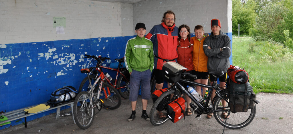 Ik ben op het verkeerde tijdstip op de verkeerde plaats en erg kwetsbaar. Maar heuvel nummer vier hoef ik niet te lopen, de wind in de rug drijft me omhoog, ik hou zelfs nog een paar tandjes over. Goddank is de weg kaarsrecht en de wind precies in mijn rug, ik moet er even niet aan denken als de wind uit een andere hoek was gekomen, die had me over de weg of het akkerland in gezwiept. Of tegen een van de vele bomen die hier staan. Intussen fiets ik in de stromende regen. Boven op de heuvel staat een groepje Oekraïense fietsers te schuilen in een bushokje. Het lukt om de weg over te steken en uit de wind kletsen we wat, wisselen adressen uit, maken foto’s en proberen niet al te veel af te koelen in de plotselinge kou. Wanneer de ergste regen voorbij is gaan we verder, elk onze eigen weg. Heuvel nummer vijf hoef ik ook niet te lopen, geholpen door de storm.